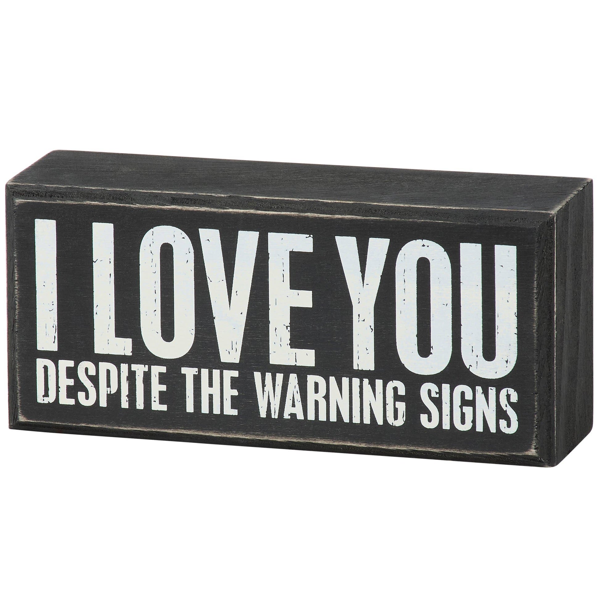 “I Love You Despite The Warning Signs” Box Sign – Funny Love Gift, Rustic Farmhouse Decor
