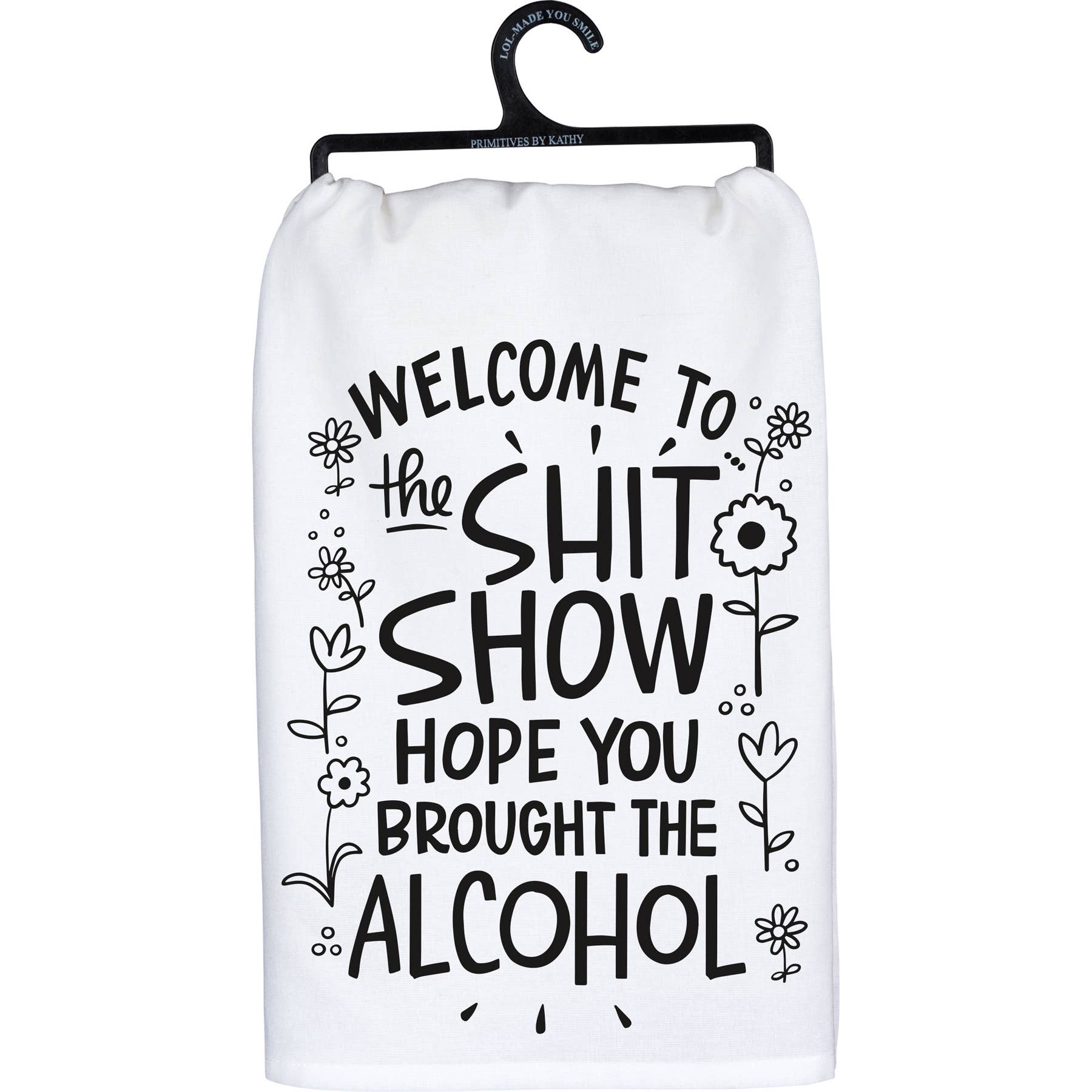 Add humor to your home with this funny black and white cotton kitchen towel from the LOL Made You Smile Collection. Featuring beautiful hand-illustrated floral designs paired with a bold, relatable sentiment that reads: