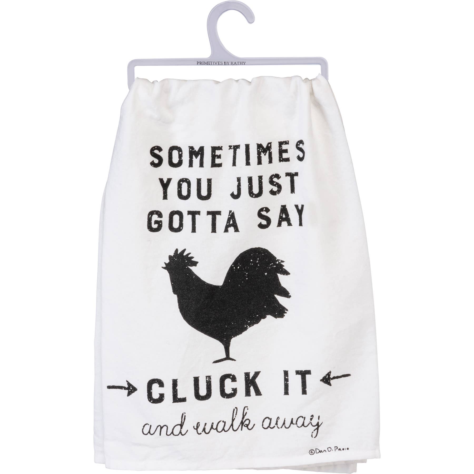A cotton kitchen towel featuring a "Sometimes You Just Gotta Say Cluck It And Walk Away" sentiment and rooster silhouette. Machine-washable.
